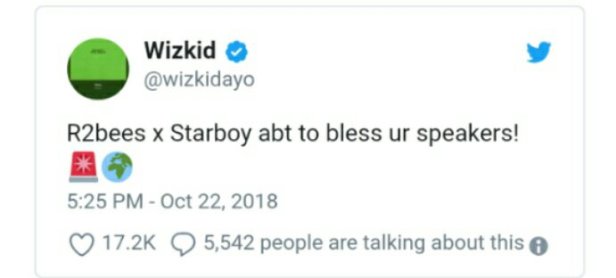 The anticipation for this new jamz was built by Wizkid who tweeted on Monday, 22nd of October that both him and R2Bees will soon be coming through to bless the speakers of fans. In his words, he said;